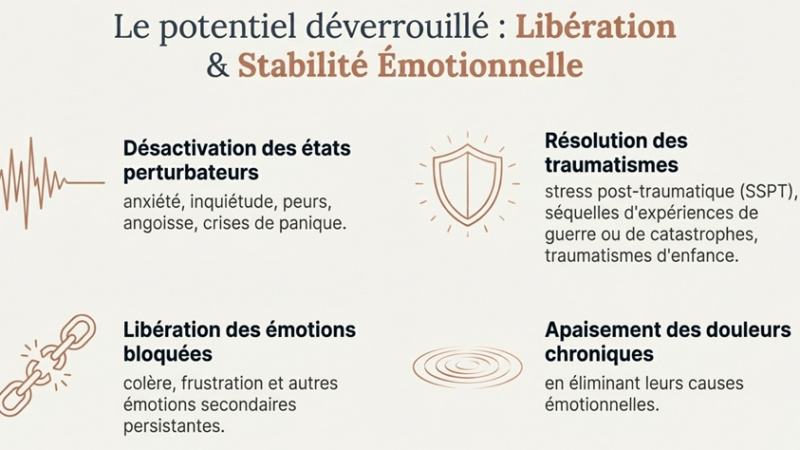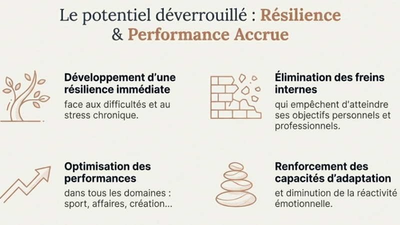 On parle d’attention absorbée et d’imagerie dirigée. Vous restez conscient et acteur. Le but n’est pas de « convaincre » mais de reprogrammer des réponses automatiques par l’expérience.